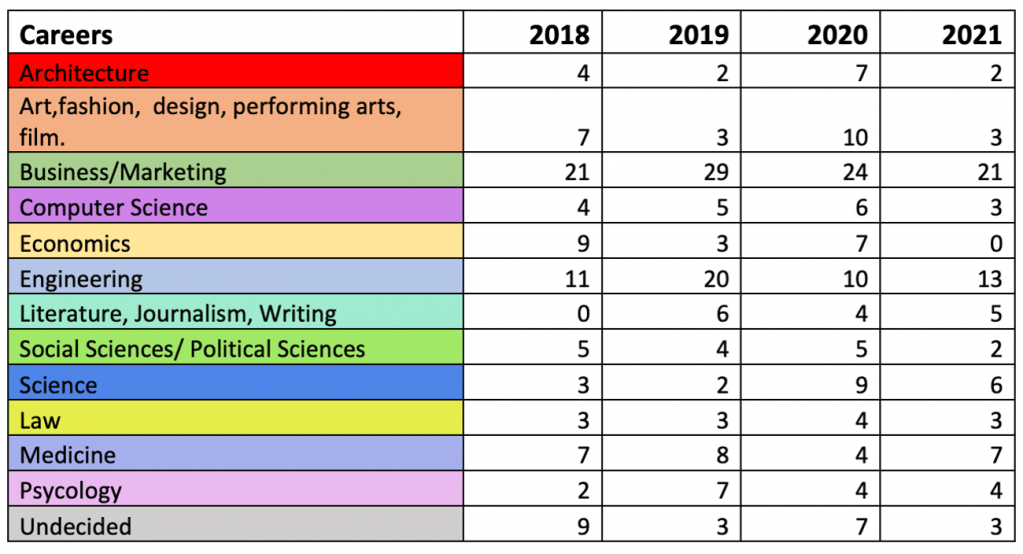 Just what are those pathway courses? Well, we’ve been studying our students’ historical interests and speaking with several universities to determine the types of courses we need to offer. Over the past several years, our graduates have sought admission into a few common programs, most notably business, engineering, and medicine. The data looks something like this: