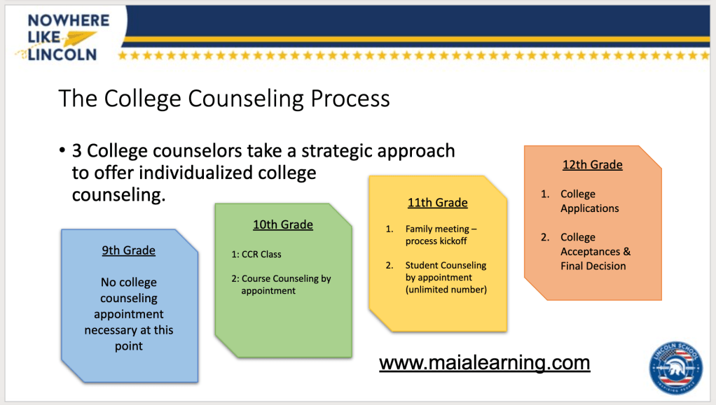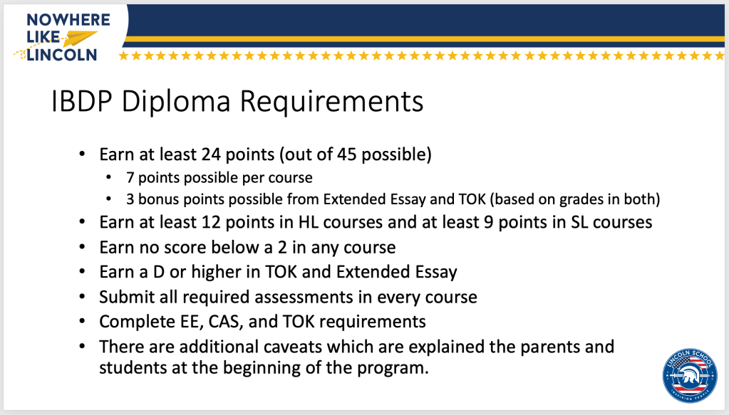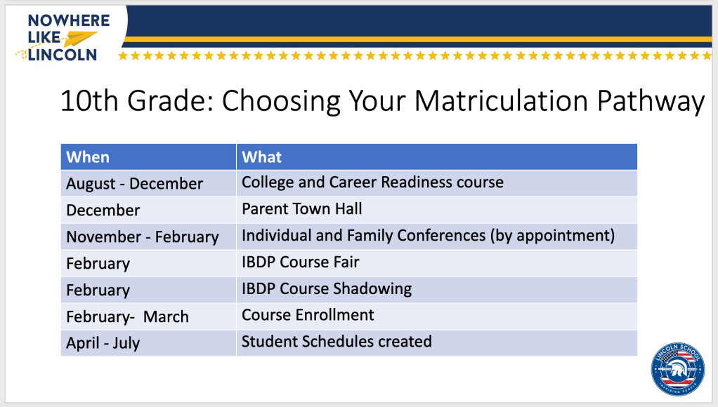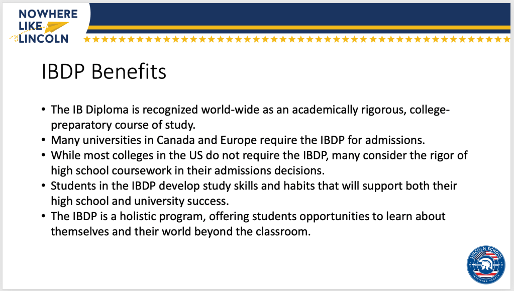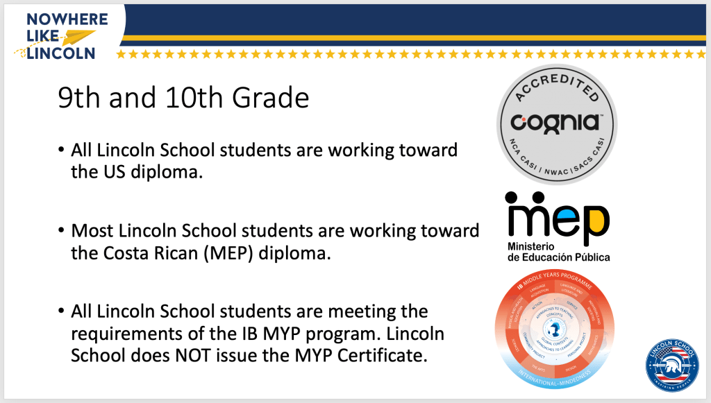 Recently, we held a town hall for our 9th and 10th grade parents to talk about our high school programs and the various matriculation pathways available to our students. It’s actually a complicated conversation here at Lincoln School because we are accredited by three different organizations and we offer students the opportunity to earn up to three separate high school diplomas. We started by reviewing the various accrediting bodies and curricular frameworks that guide our academic programs in grades 9 and 10 and followed that with a quick overview of the same for grades 11 and 12. In short, all students at Lincoln School earn the US diploma through our accreditation with Cognia Education. Most of our students earn the Costa Rican MEP diploma as well, with the only exception being our non-Costa Rican students who do not plan on continuing their education in Costa Rica after graduation. Finally, many (typically around 60%) of our students earn the IB Diploma by participating in the IB Diploma Programme in 11th and 12th grade.